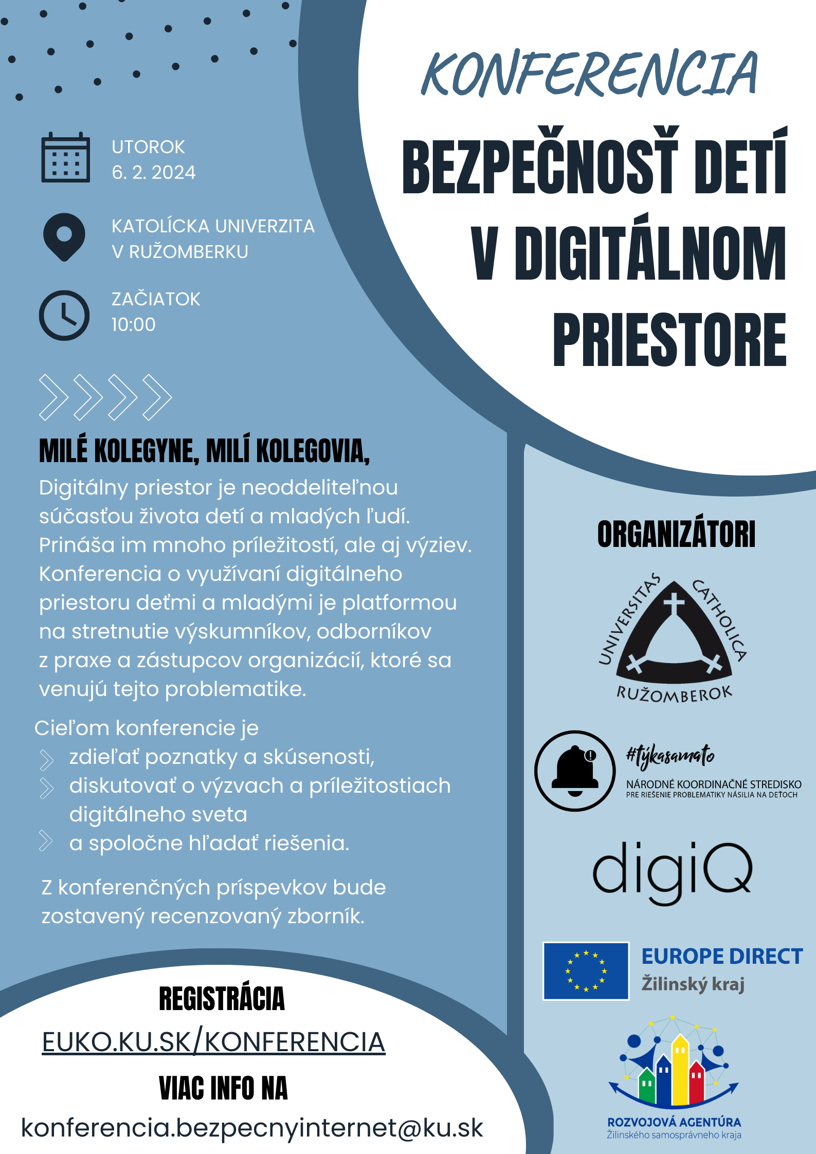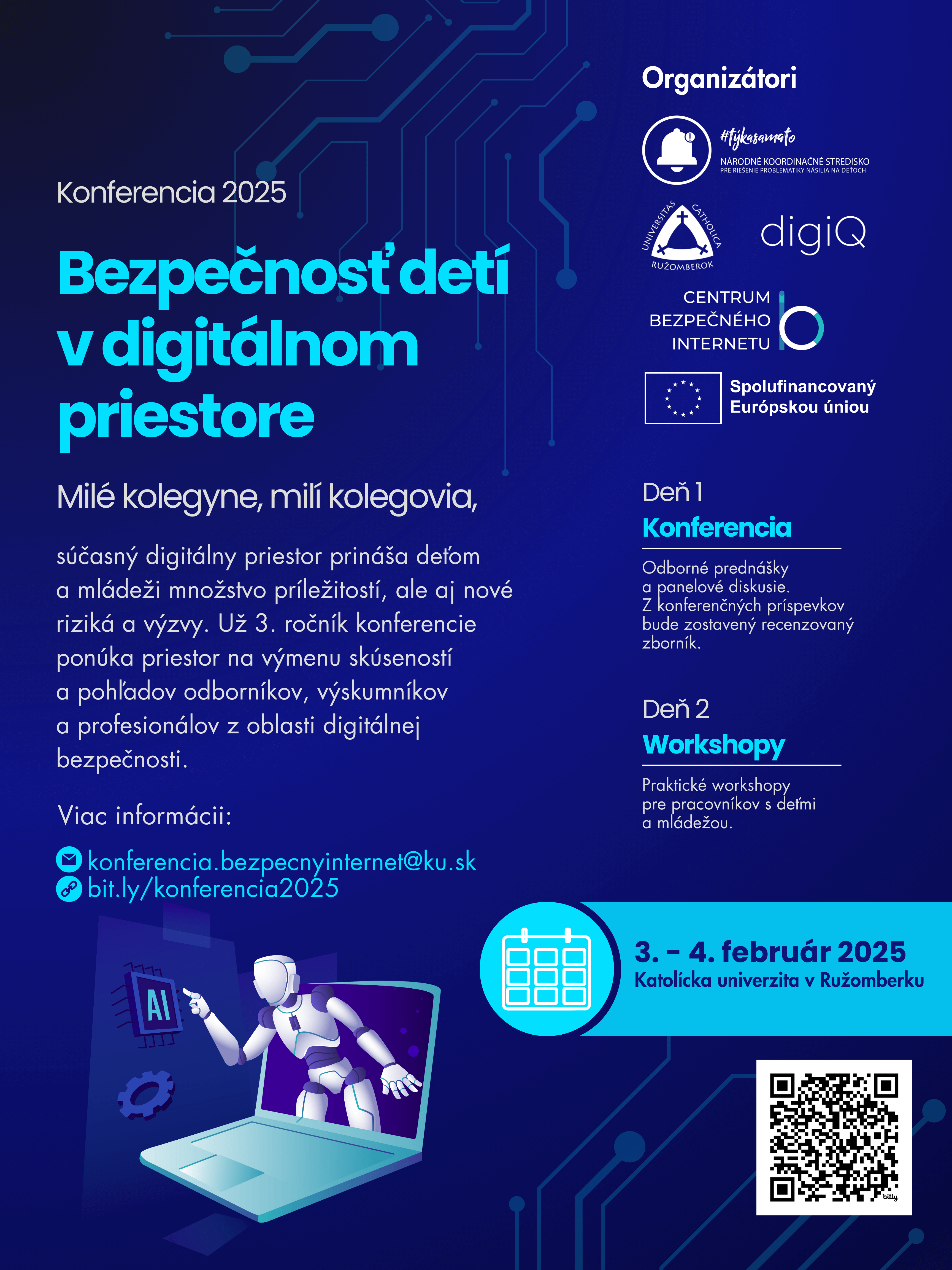 Digitálny svet je dnes neoddeliteľnou súčasťou života detí a mládeže. Prináša so sebou nespočetné možnosti pre vzdelávanie, komunikáciu a rozvoj, no zároveň aj riziká a výzvy, ktoré nemožno ignorovať. Naša konferencia ponúka priestor na otváranie dôležitých tém spojených s bezpečnosťou, zodpovedným využívaním technológií a digitálnou gramotnosťou.